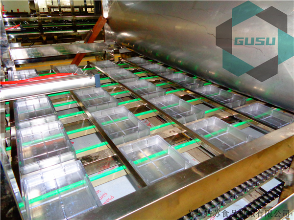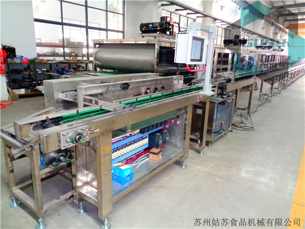 純巧克力(包括一次成型夾心巧克力)生產(chǎn)時其工作原理如下:模板由鏈條依次帶入烘模、澆注、振動各工位。完成烘模、澆注、振動,然后經(jīng)澆注的模板進(jìn)入模板翻轉(zhuǎn)段,在該程序下,模板翻轉(zhuǎn)部件不工作,接著模板進(jìn)入雙向運(yùn)轉(zhuǎn)機(jī)構(gòu),由雙向運(yùn)轉(zhuǎn)機(jī)構(gòu)送入冷道入口處(此程序下雙向運(yùn)轉(zhuǎn)機(jī)構(gòu)為單向運(yùn)轉(zhuǎn)),由單模拉模氣缸和四模拉模氣缸一起工作將模板拉入冷道,再經(jīng)冷道冷卻,由冷道內(nèi)鏈條帶至出料輸送部件,由出料輸送帶送入主傳動部件,再由鏈條依次帶入扭模、脫模工位,脫出的巧克力由成品輸送帶送出,空模板進(jìn)入下一工作循環(huán)。